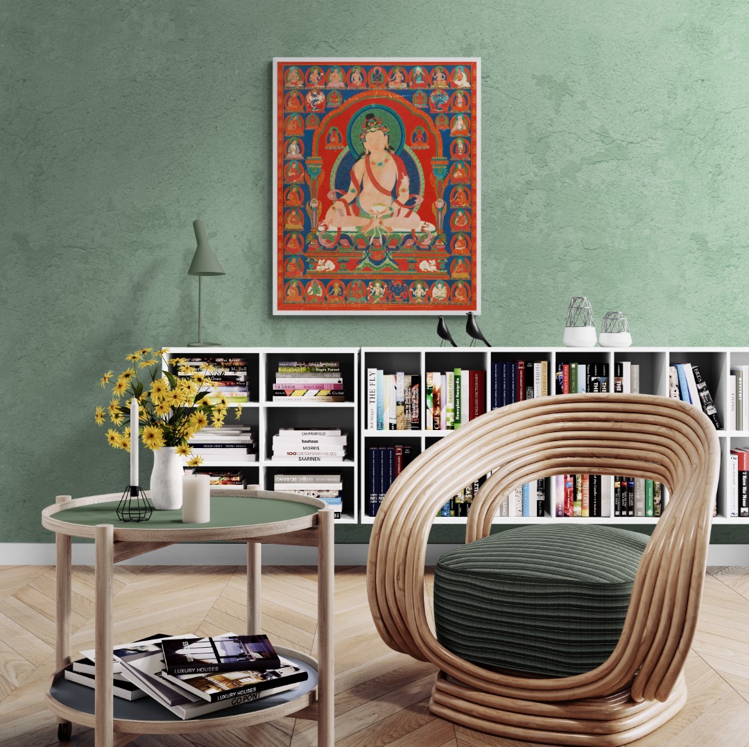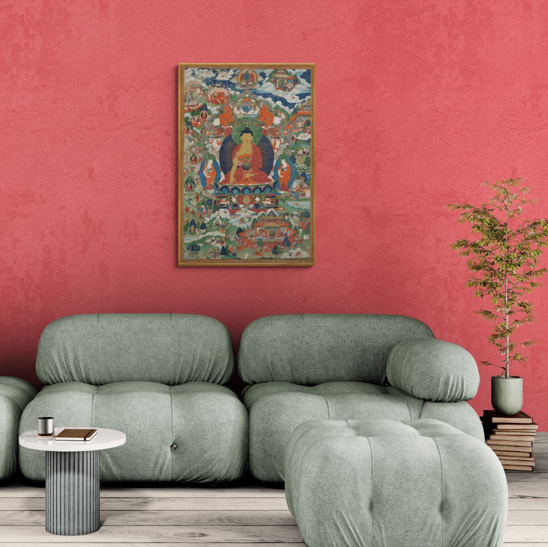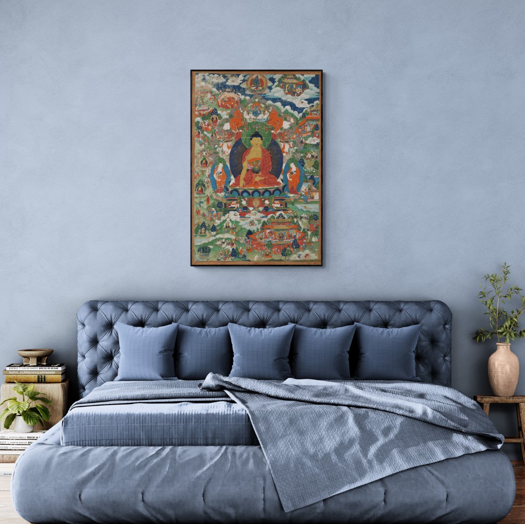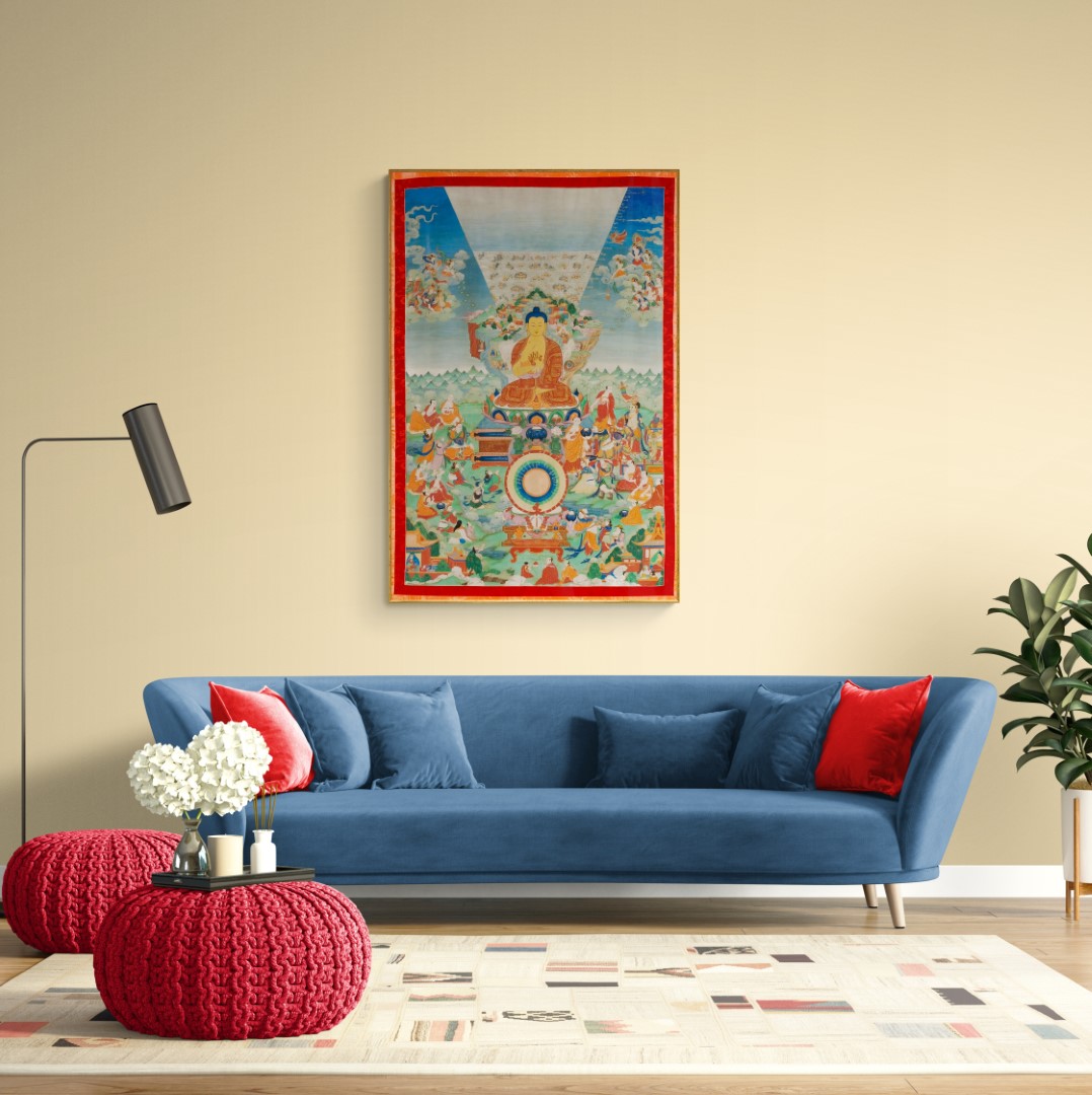 Tibet – Painting – Wall art – Photo – Thangka depicting Buddha Shakyamuni at Mount Meru , 18th-century